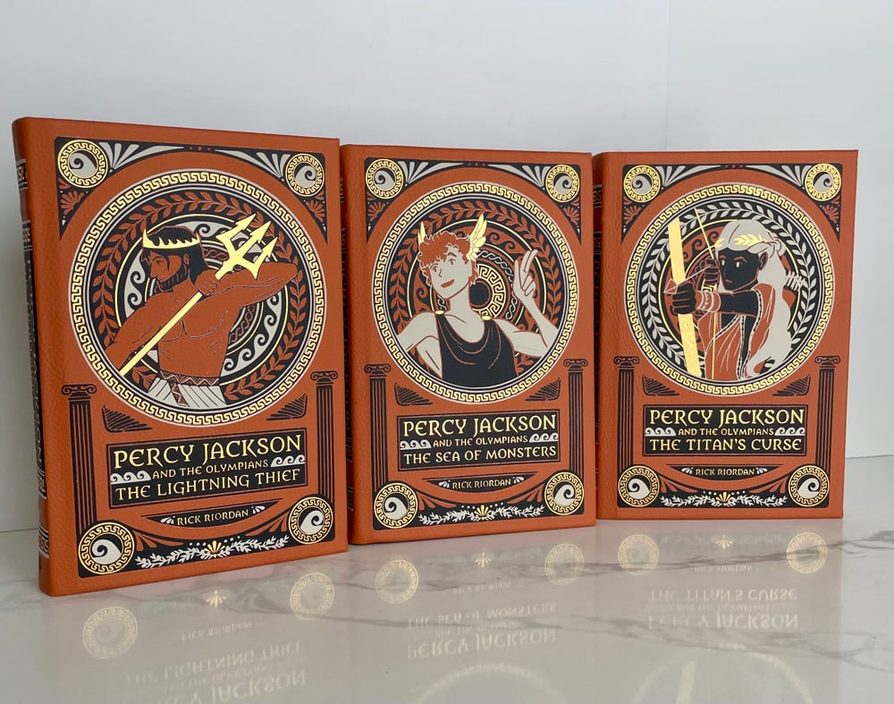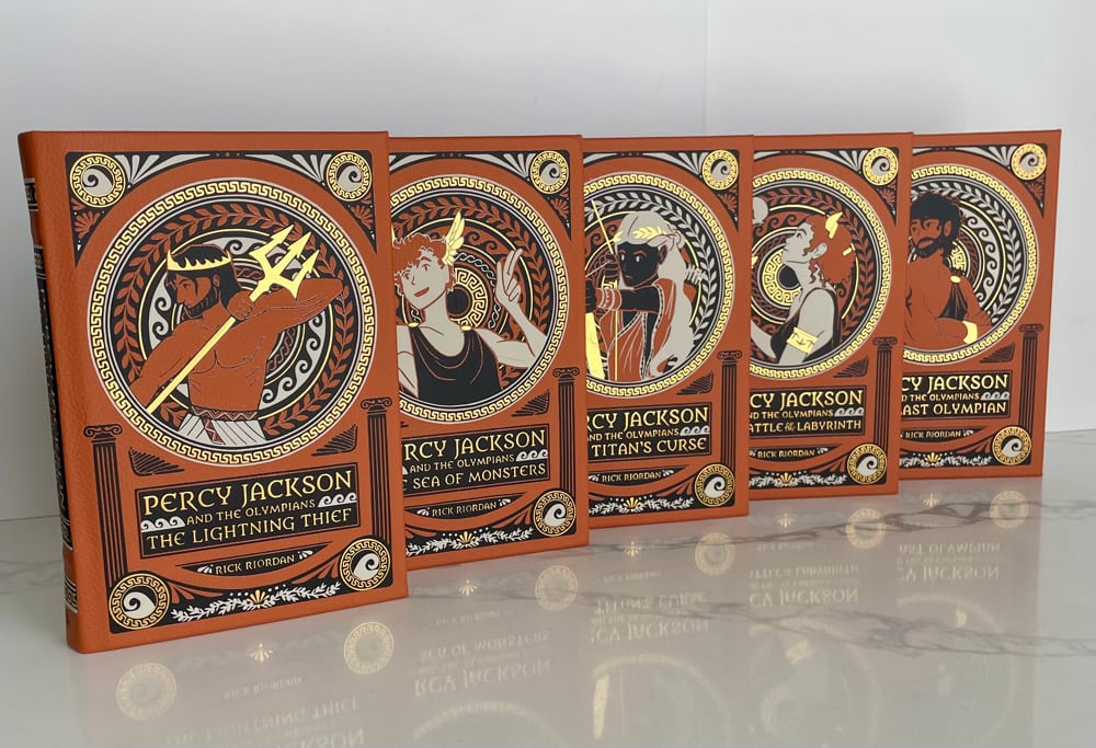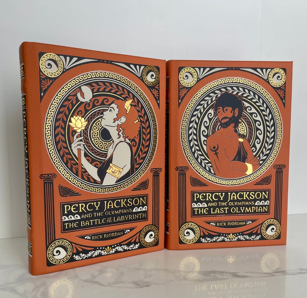 Rebind of Percy Jackson and the Olympians 5 book series featuring hand drawn Greek Gods on each cover. Cover is all hand drawn, cut via a cricut, and assembled using three layers of htv and negative space to create a new design on faux leather.