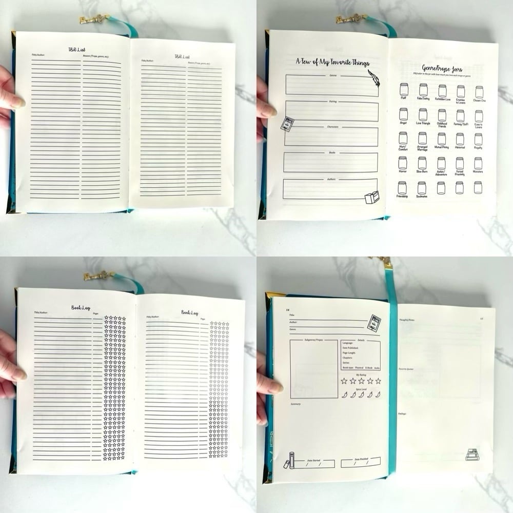 A Reading Journal for the book lovers in us all. Easily keep track of every book you read with personal ratings, spice level, thoughts, quotes, and genres. These journals are designed and made by hand in-house from sewing the pages together to gluing the text block into faux leather cover and the foil design on the end pages. By a book lover, for a book lover.